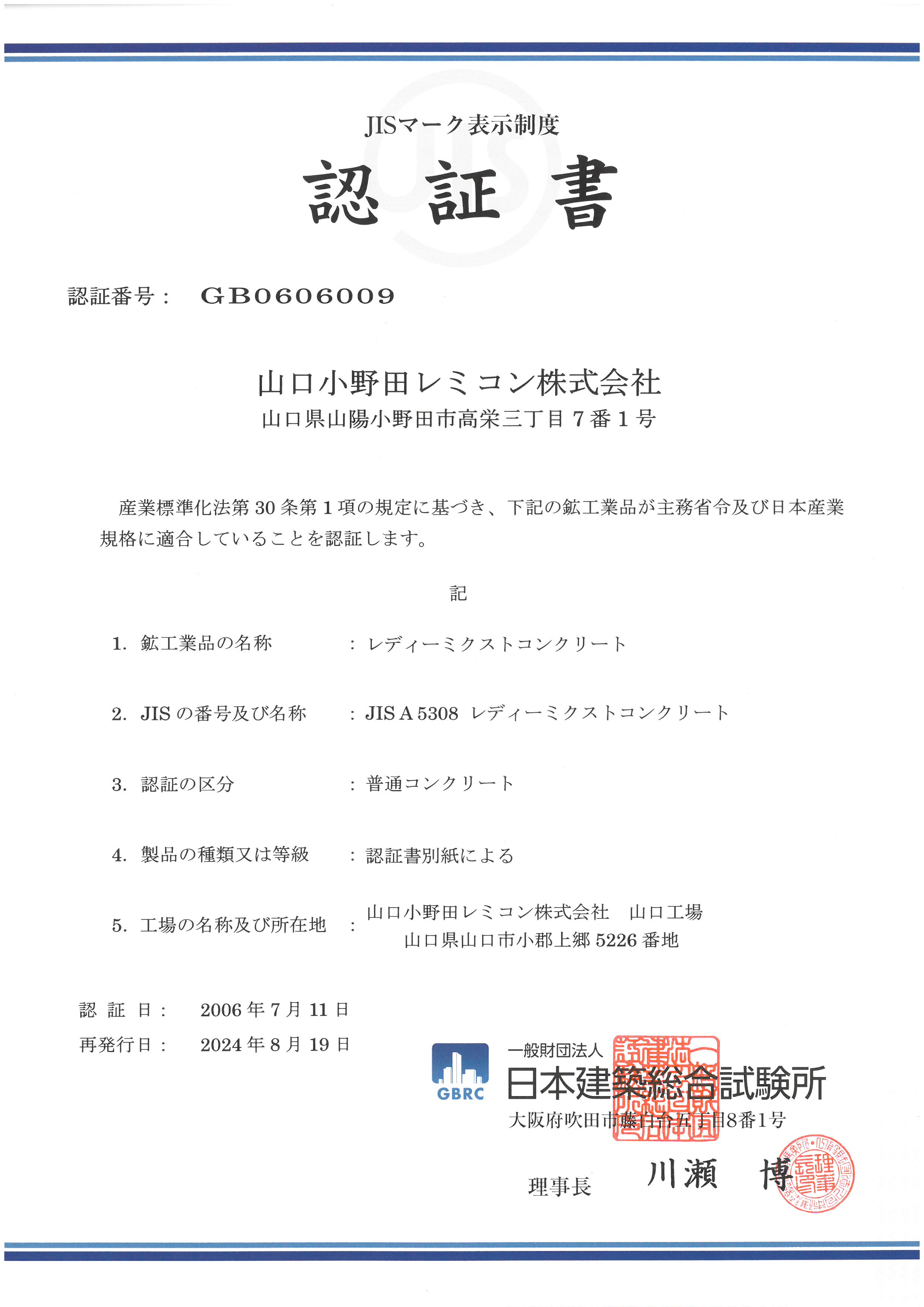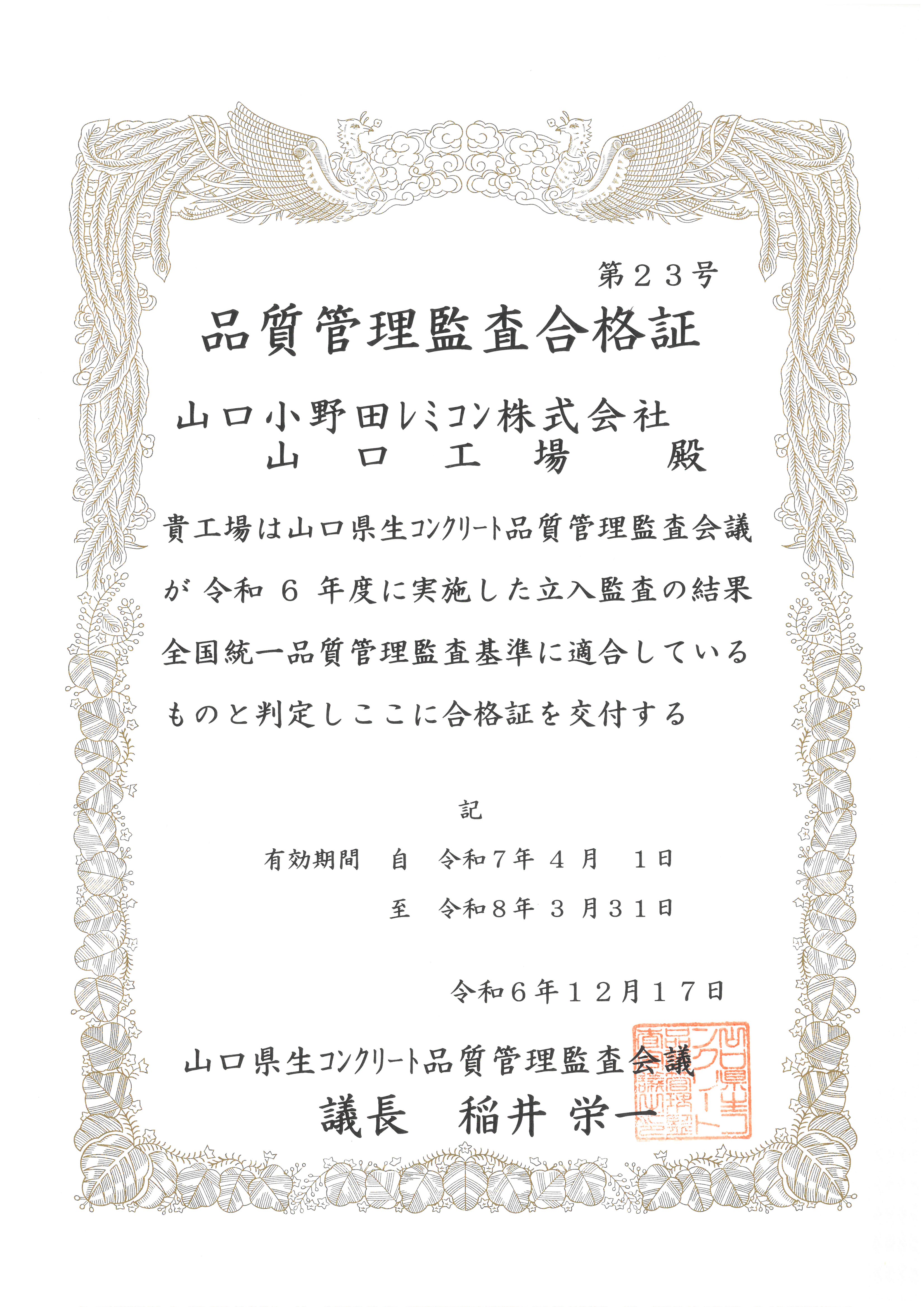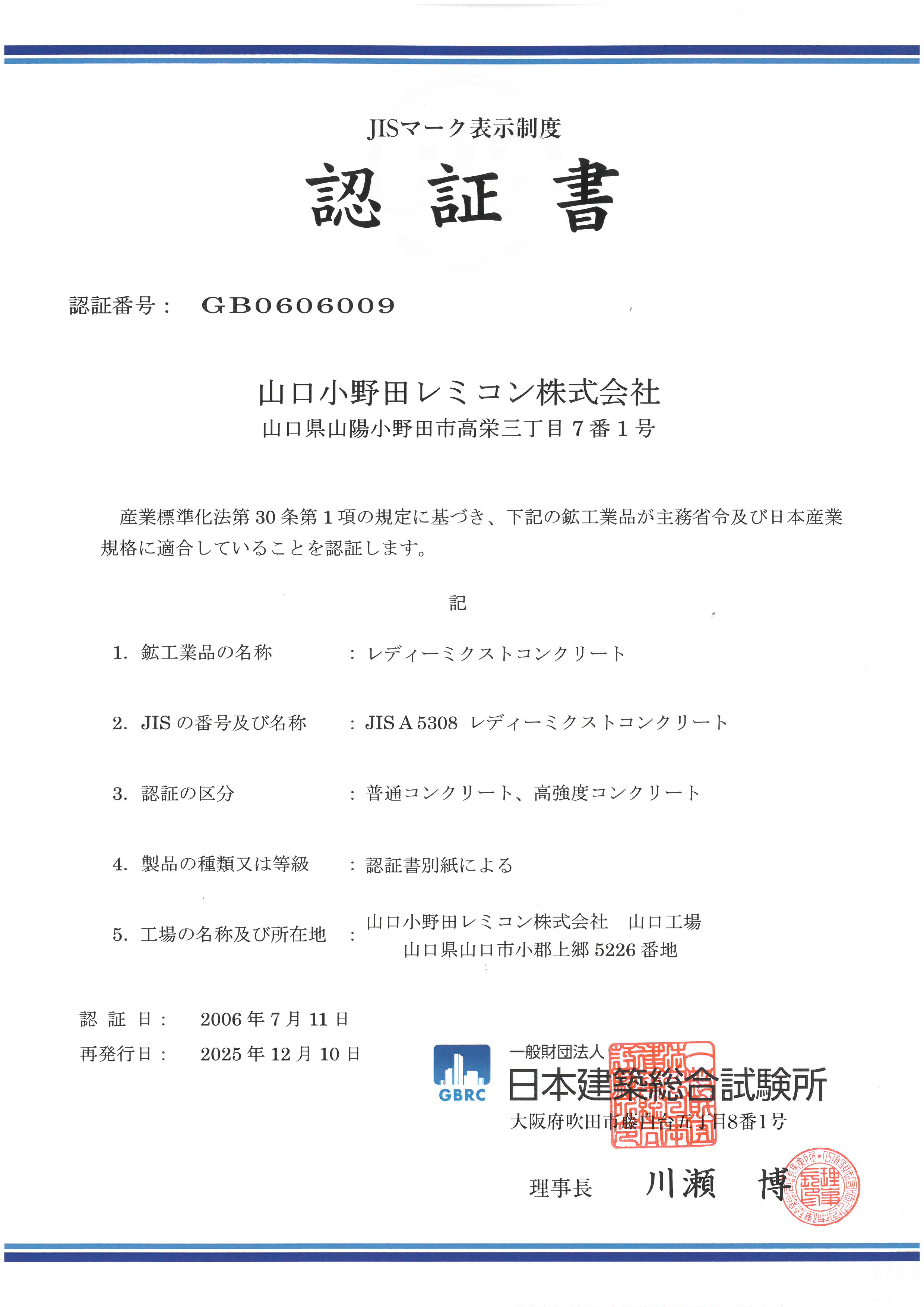 山口工場に社名変更 平成17年 6月 中国経済産業局 事業継承、立入検査適合 平成17年 7月 ISO 9001 審査登録 登録番号:RQ1759 平成18年 7月 JIS A 5308認証 認証番号:GB0606009 平成19年 3月 ISO 9001 第1回更新審査の受審 平成20年11月 JIS A 5308 第1回認証維持審査の受審 平成22年 3月 ISO 9001 第2回更新審査の受審 平成23年11月 製品認証対象品目の変更(舗装コンクリート辞退) 平成23年11月 JIS A 5308 第2回認証維持審査の受審 平成25年 3月 ISO 9001 第3回更新審査の受審 平成26年 5月 ISO 9001認証取り下げ 平成28年10月 中国経済産業局 立入検査適合